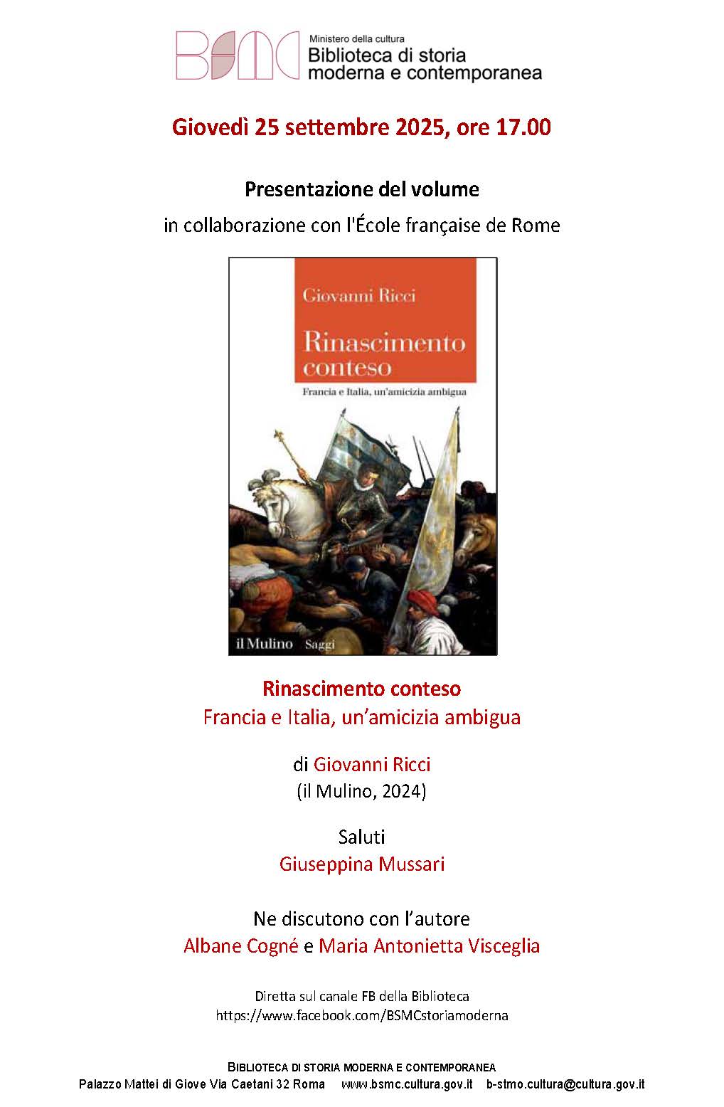 Giovedì 25 settembre 2025, ore 17.00 Presentazione del volume in collaborazione con l’École française de Rome Rinascimento conteso Francia e Italia, un’amicizia ambigua di Giovanni Ricci (il Mulino, 2024) Saluti